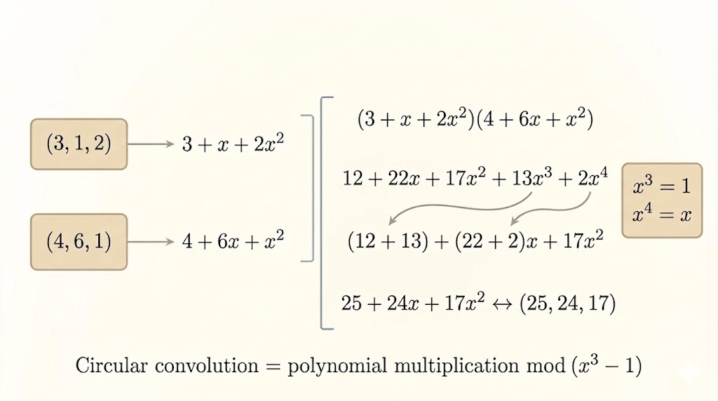 For length \(n=3\), circular convolution means working modulo