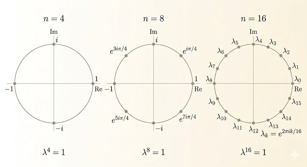 \[ 1,\; \omega,\; \omega^2,\; \dots,\; \omega^{N-1}, \qquad \omega = e^{2\pi i / N}. \]