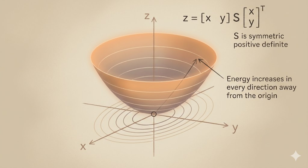 For a positive definite matrix, the quadratic form \(x^\top S x\) is an energy bowl: minimum at the origin, rising in every direction.