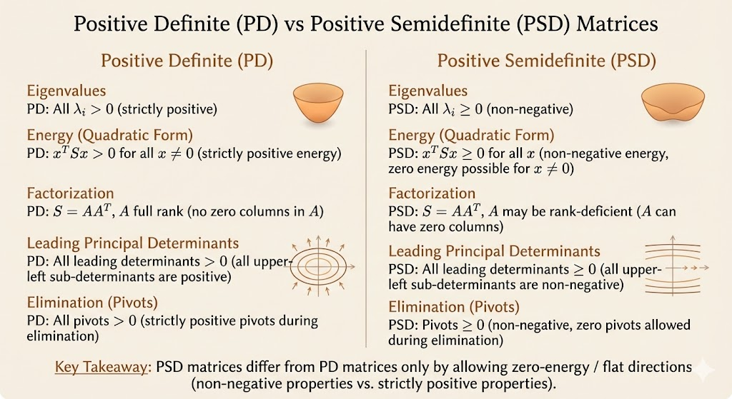 Equivalent tests (for symmetric \(S\)): - All eigenvalues are positive - Cholesky exists with positive pivots (same as positive leading principal minors)