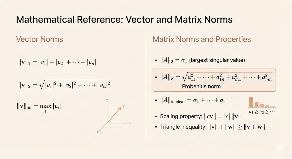 - L∞ norm (max norm): \(\|v\|_\infty = \max_i |v_i|\)