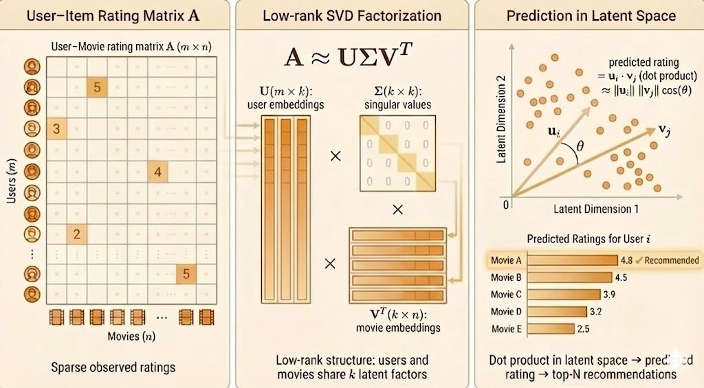- \(A \in \mathbb{R}^{m \times n}\): \(m\) users × \(n\) movies (sparse, mostly unrated)