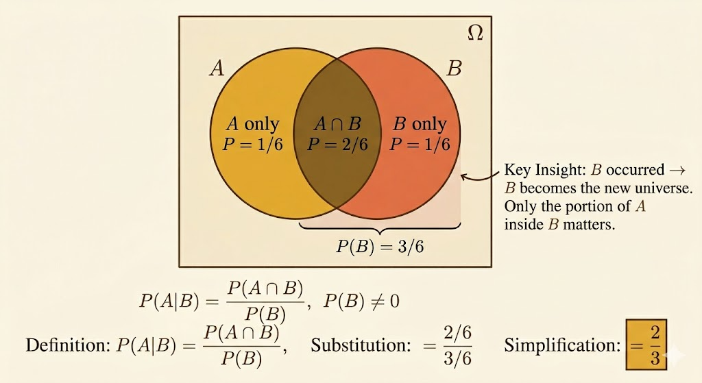 So conditioning does not invent a new probability law. It rescales the old one onto the smaller world where \(B\) is known to have occurred.
