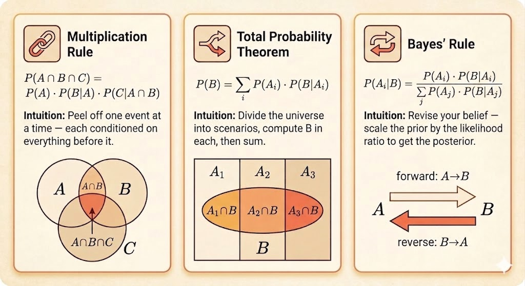 - Bayes’ rule reverses conditioning and turns priors into posteriors