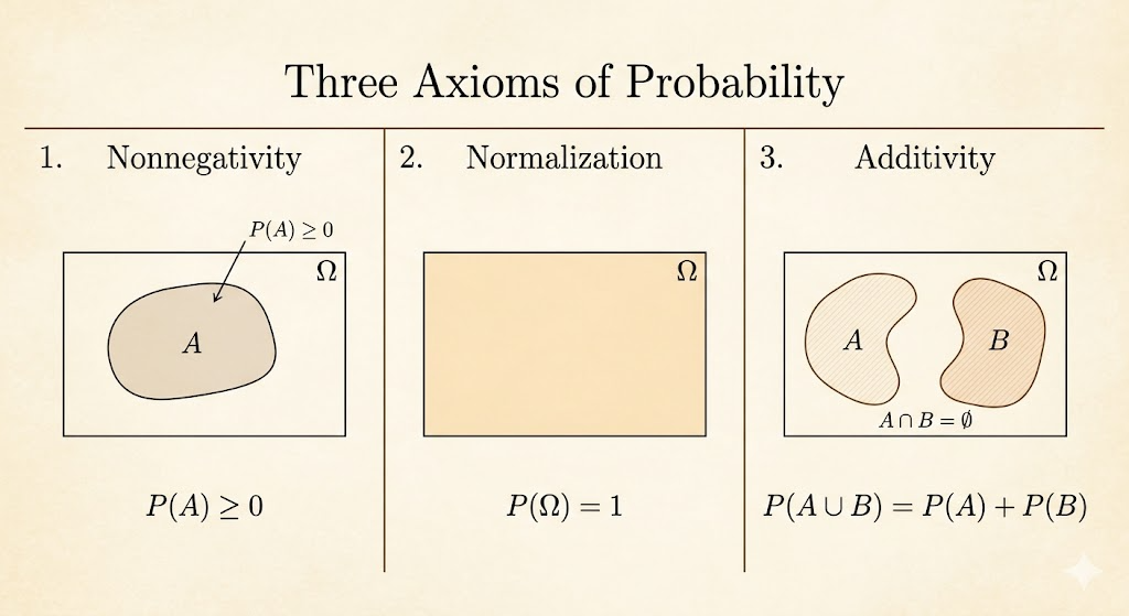 - additivity: if \(A \cap B = \emptyset\), then \(P(A \cup B) = P(A) + P(B)\)